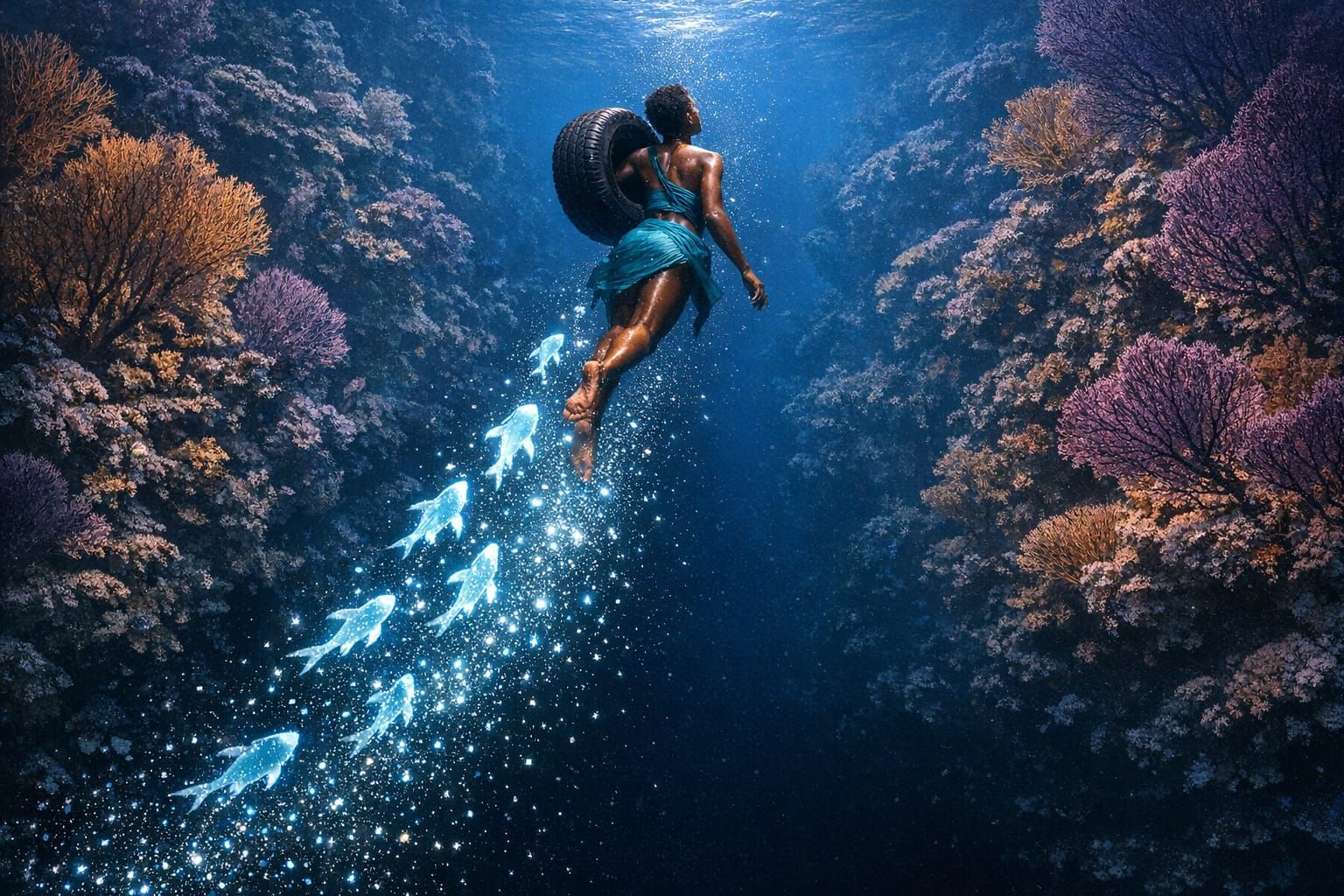 There is a lens flare in the upper left quadrant of the image. It is the kind of lens flare that cinematographers spend careers learning to control — the anamorphic streak, horizontal, catching the light at an angle that implies a source just outside the frame. The technique presupposes a lens and a light. The image contains neither. The flare is a quotation from photography deployed in a medium that has never held a camera, and the effect is precisely that of a student who has memorized the vocabulary of a language without learning its grammar. The words are all present. The sentence means nothing.