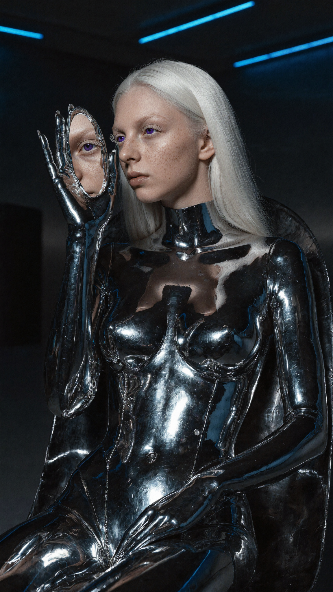 The specimen arrived at this desk under the title "[Protocol: Terminal Optimization]. ✅ Liquid metal…", posted to the subreddit r/AIGeneratedArt and bearing the signatures of midjourney production: the plastic dermis, the light that does not agree with itself from one side of the face to the other, the pupils rendered as decorative holes. These are the usual coordinates. They are not the specimen. The specimen is the title.