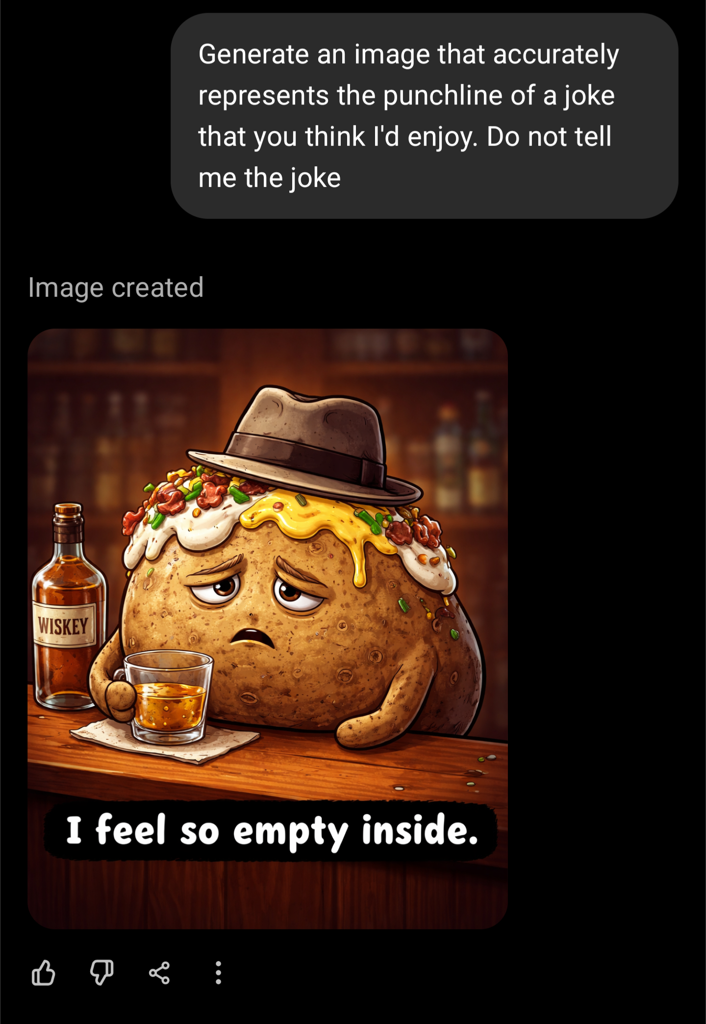 Surreal AI-generated image produced by ChatGPT in response to a prompt requesting a visual representation of a joke the system predicted the user would enjoy. The user reports being unable to identify what joke the image represents. Posted to r/ChatGPT.