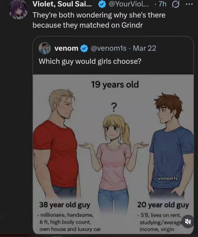 **T**HE specimen is a palimpsest of four decisions, and only one of them is interesting. An anime-style illustration presents a familiar tableau: two men flank a young woman, who shrugs beneath a question mark. The men are labeled with their specifications. The left figure is thirty-eight, a millionaire, handsome, six feet tall, possessed of a high body count, a house, and a luxury car. The right figure is twenty, five foot eight, renting, studying, average of income, a virgin. Between them the woman stands at nineteen, unburdened by a single descriptor, because she is not a person in this composition. She is the mechanism by which the two product listings are compared. The original poster, @venom1s, captions the arrangement: "Which guy would girls choose?" The question mark over the woman's head is the only honest element in the frame.