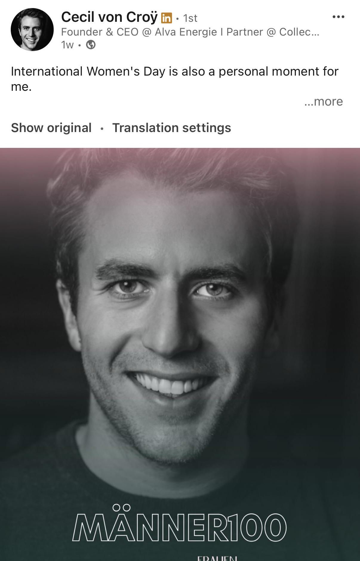 German-language founder deploys full apparatus of personal branding to produce machine-generated headshot bearing legend "Men 100" on the one day of the calendar year nominally reserved for the opposite sex.