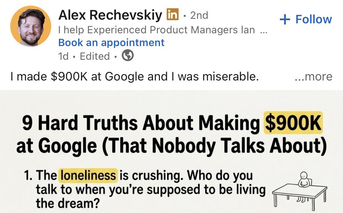 The vulnerability-to-funnel pipeline has, like most American industries, achieved a degree of vertical integration that deserves study on its own terms. A LinkedIn post by one Alex Rechevskiy, identified in his profile as a product management coach, presents a carousel-style graphic bearing the title "9 Hard Truths About Making $900K at Google (That Nobody Talks About)." The first slide, visible in the specimen as recovered from Reddit's r/LinkedInLunatics forum, announces Truth No. 1: "The loneliness is crushing." Beneath this declaration sits a small illustration of a solitary figure at a desk, rendered in the flat, affectless style of clip-art that has passed through one too many abstraction layers. The word "loneliness" is highlighted in yellow. So is "$900K." The highlighting makes no distinction between the two. This is, in its way, the most honest element of the production.