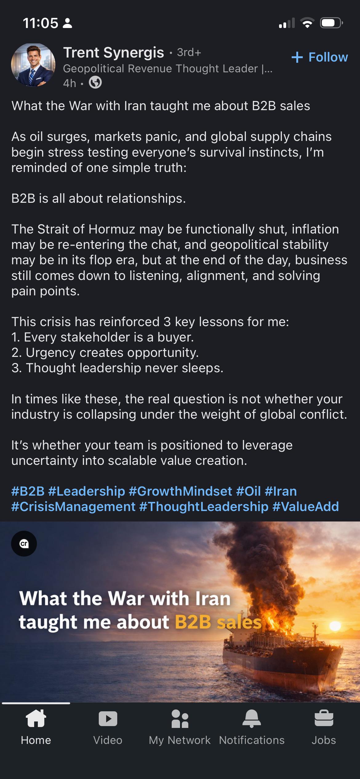 The specimen under review, recovered from the Reddit forum r/LinkedInLunatics, documents one such production: a LinkedIn post titled "What the war with Iran taught me about B2B sales." The war in question is not metaphorical. It is the armed engagement between the United States and Iran, a conflict involving naval deployments, airstrikes, and the kind of geopolitical complexity that, in an earlier informational era, might have resisted compression into a listicle about pipeline management. In this era, the compression is frictionless.