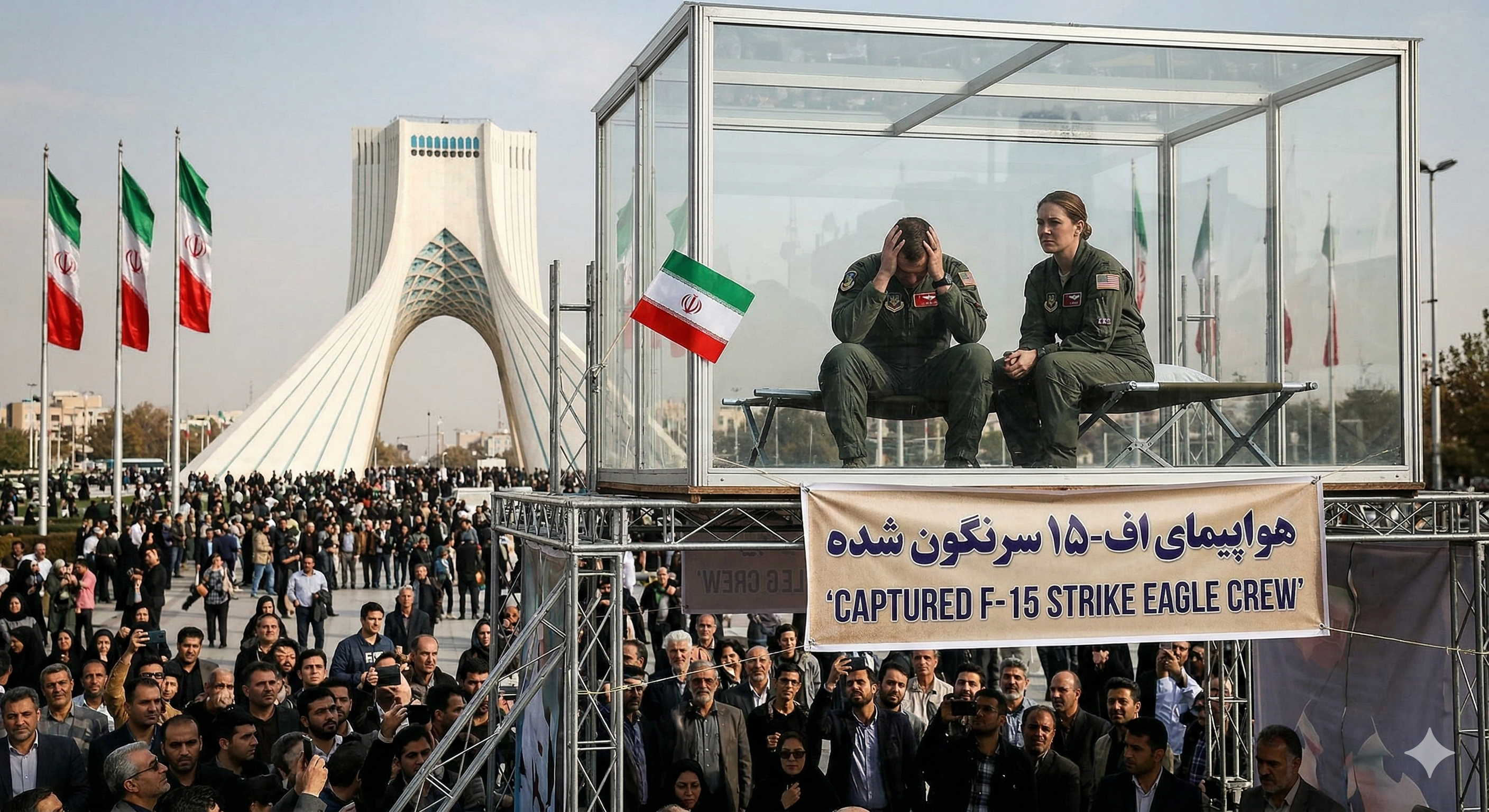 TEHRAN (SYNTHETIC) — — The crowd is enormous and jubilant. The aircraft hang above the avenue like offerings. Two F-15 Eagles—or what a machine believes F-15 Eagles to be—are suspended in the air over a dense column of Iranian civilians, nose-down, at angles that suggest either anti-gravity or very sturdy cable, presented to the masses with all the ceremony of a national holiday and none of the engineering. The scene does not exist. It has never existed. But it is, in its way, complete.